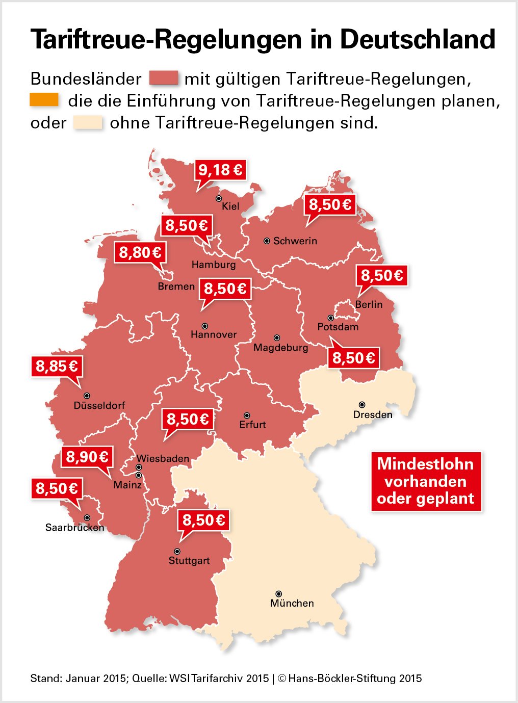 Zum Jahresbeginn (Stand: Januar 2015) gab es in 14 von 16 Bundesländern Tariftreue-Regelungen für die Vergabe öffentlicher Aufträge: In diesen Ländern müssen sich Unternehmen bei öffentlichen Aufträgen also beispielsweise verpflichten, Tariflöhne zu zahlen. in zwölf von 16 Bundesländern gibt es "vergabespezifische Mindestlöhne", an die sich Auftragnehmer öffentlicher Aufträge halten müssen. Das hat der Europäische Gerichtshof jetzt als vereinbar mit europäischem Recht ausdrücklich erlaubt.